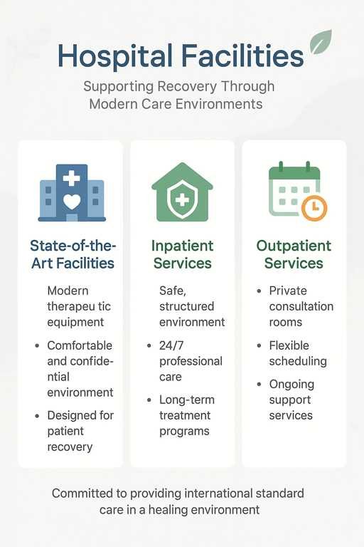 PIMH provides state-of-the-art facilities to support patient recovery. Our environment is designed to offer both comfort and confidentiality, with private consultation rooms and modern therapeutic equipment. Our inpatient services offer a safe, structured environment for patients requiring long-term care, while our outpatient facilities support those needing regular consultations.