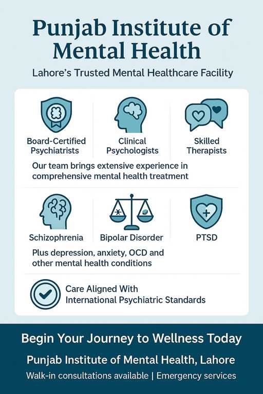 At Punjab Institute of Mental Health, Jail Road, Lahore, our hospital is staffed with board-certified psychiatrists, clinical psychologists, and highly skilled therapists. Each professional has extensive experience in treating a wide range of conditions such as schizophrenia, bipolar disorder, and PTSD. Their expertise ensures that patients receive the highest quality of care, using techniques that are aligned with international psychiatric standards.