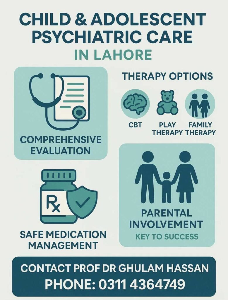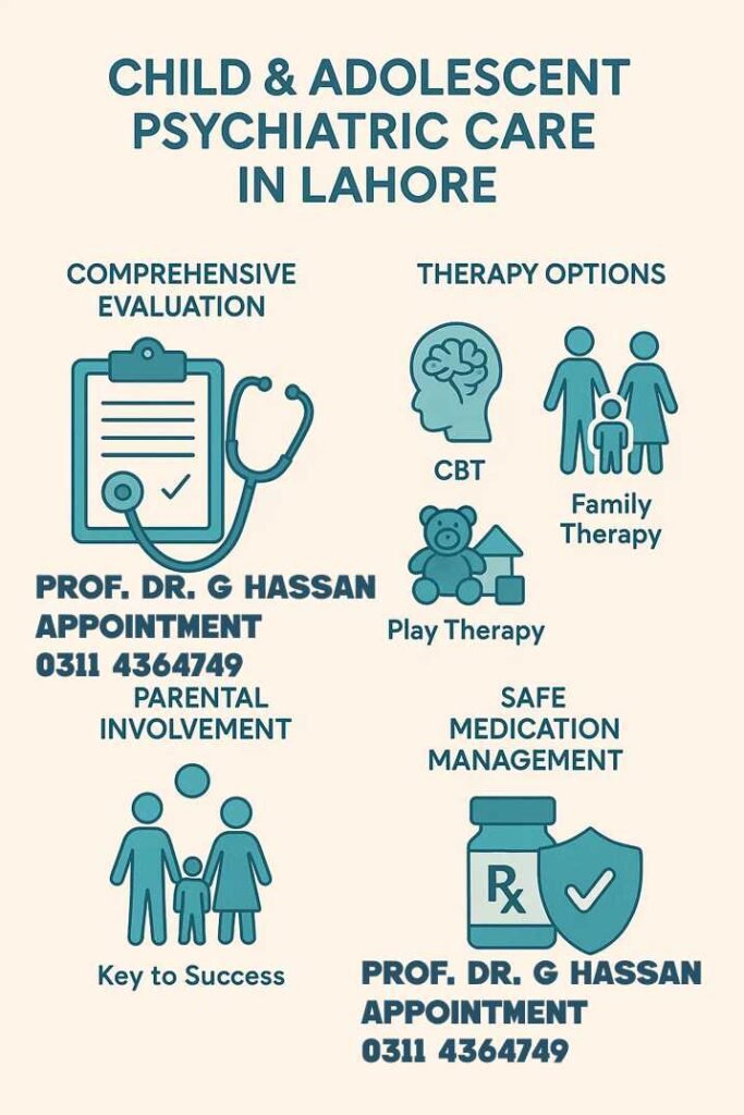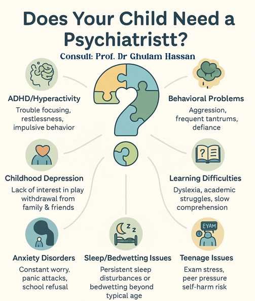 Whether it’s a child grappling with depression or an adolescent showing signs of ADHD, timely intervention is crucial. Early diagnosis and tailored treatment plans can make all the difference. Teenage mental health issues are frequently triggered by intense exam stress, negative peer pressure, and in serious cases, can include a risk of self-harm and for parents in Lahore, knowing where to seek help is the first step. Of Course, From Professor Dr. Ghulam Hassan, a reliable psychiatrist in Lahore. You can discuss problems like ADHD, Autism, Depression, Anxiety, Behavior Issues, Learning Problems, Sleep Issues and other Teen Mental Health issues with him.
