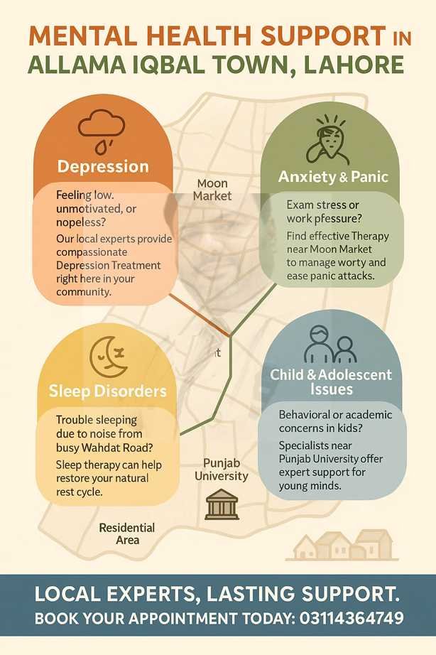 Life in Allama Iqbal Town moves fast. Traffic on Wahdat Road, deadlines at Punjab University, and family pressures pile up. Mental health struggles like anxiety or depression can hit anyone. Local psychiatrists understand these challenges. They offer tailored care for students, professionals, and families near Karim Block Market. Ignoring mental health isn’t an option early treatment prevents bigger issues.