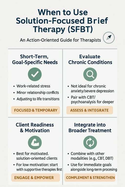 - For Short-Term, Goal-Specific Needs: Use SFBT for temporary issues like work-related stress or minor relationship conflicts.